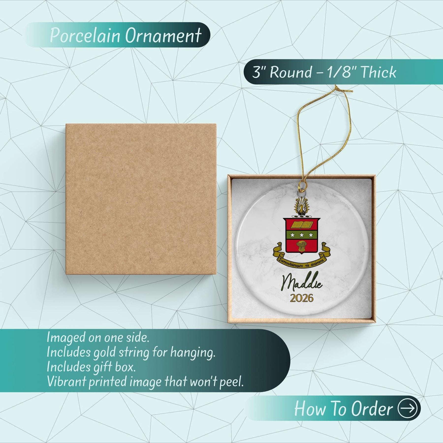 Discover our elegant 3" Round Porcelain Ornament. Crafted with care, it features a unique image on one side with a vibrant gloss finish. This ornament shines beautifully, reflecting light off its surface. It includes a luxurious gold string for easy hanging and a charming gift box, making it a perfect present. This isn't just a decoration, it's a piece of art to elevate your home decor.