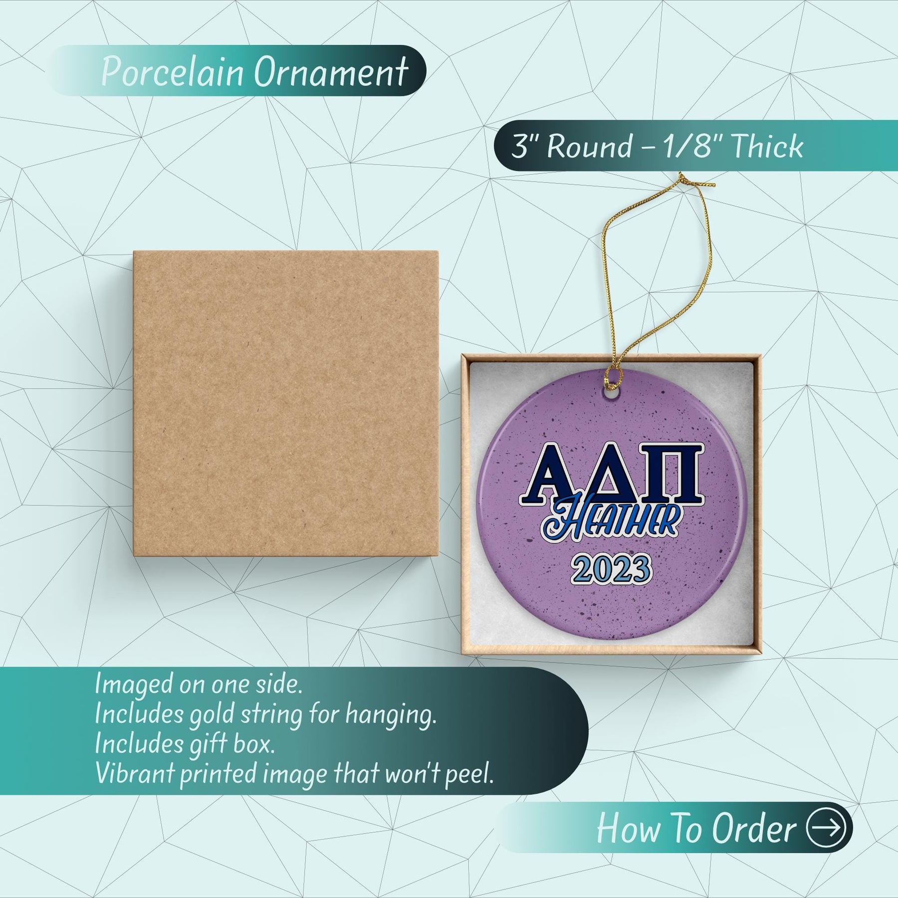 Discover our elegant 3" Round Porcelain Ornament. Crafted with care, it features a unique image on one side with a vibrant gloss finish. This ornament shines beautifully, reflecting light off its surface. It includes a luxurious gold string for easy hanging and a charming gift box, making it a perfect present. This isn't just a decoration, it's a piece of art to elevate your home decor.