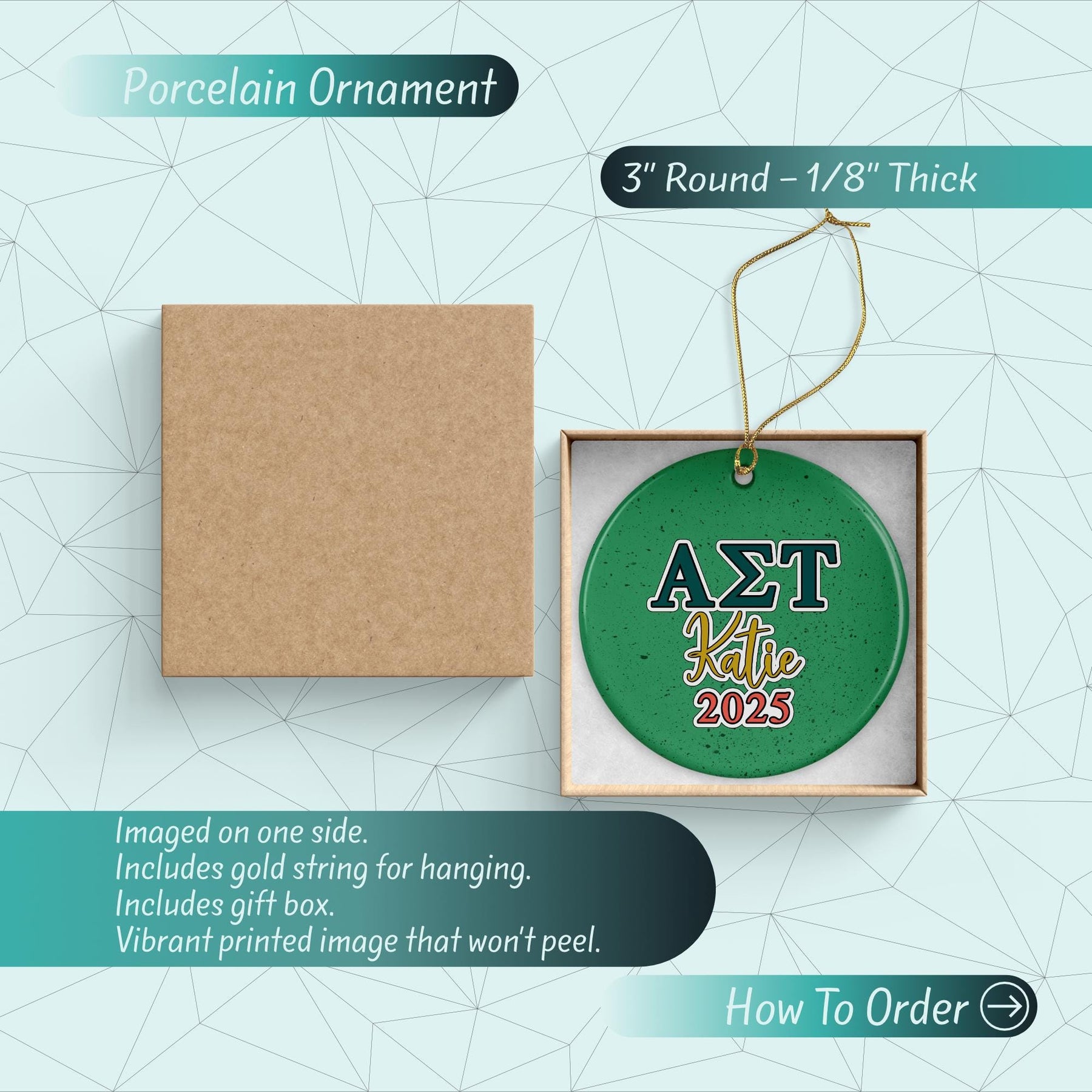 Discover our elegant 3" Round Porcelain Ornament. Crafted with care, it features a unique image on one side with a vibrant gloss finish. This ornament shines beautifully, reflecting light off its surface. It includes a luxurious gold string for easy hanging and a charming gift box, making it a perfect present. This isn't just a decoration, it's a piece of art to elevate your home decor.