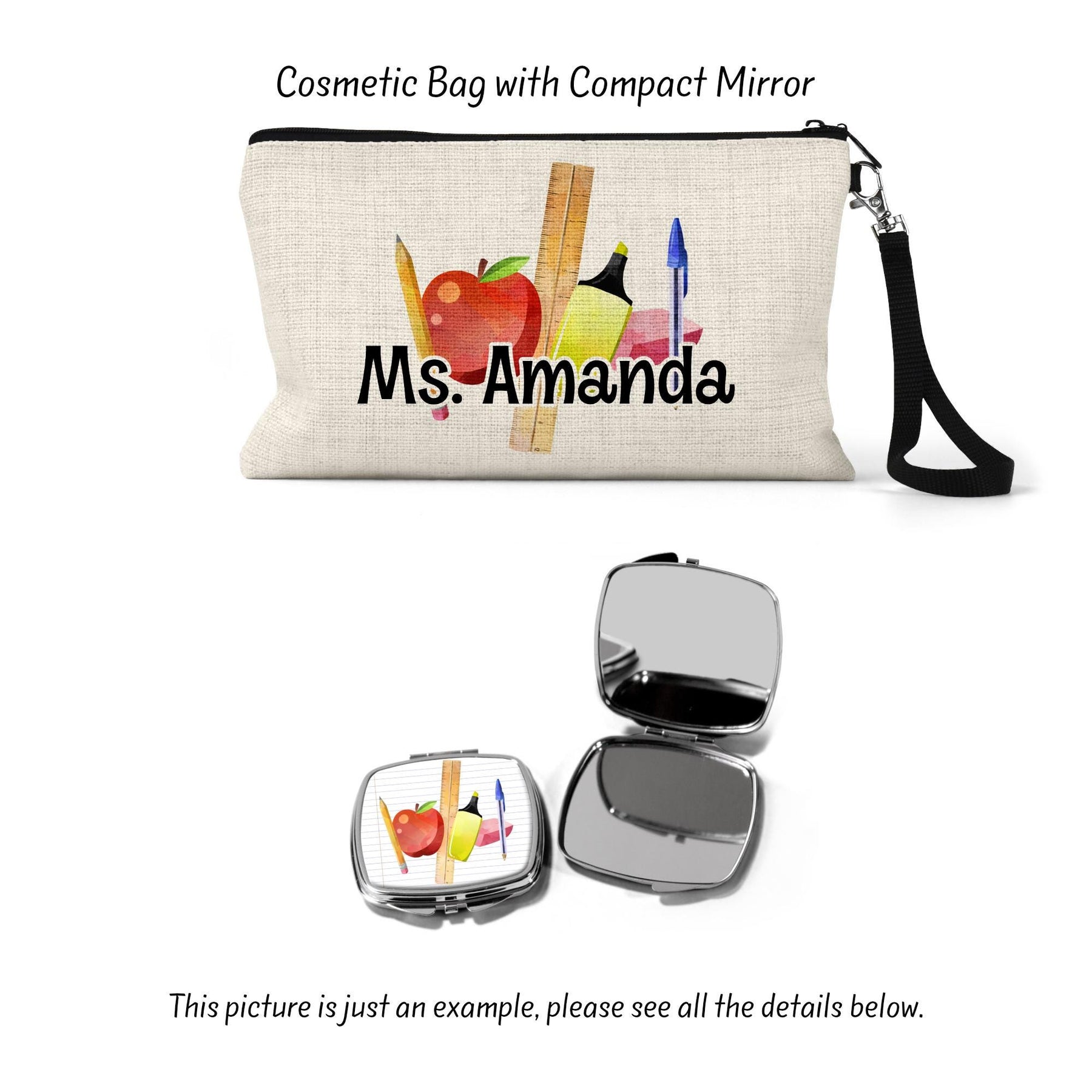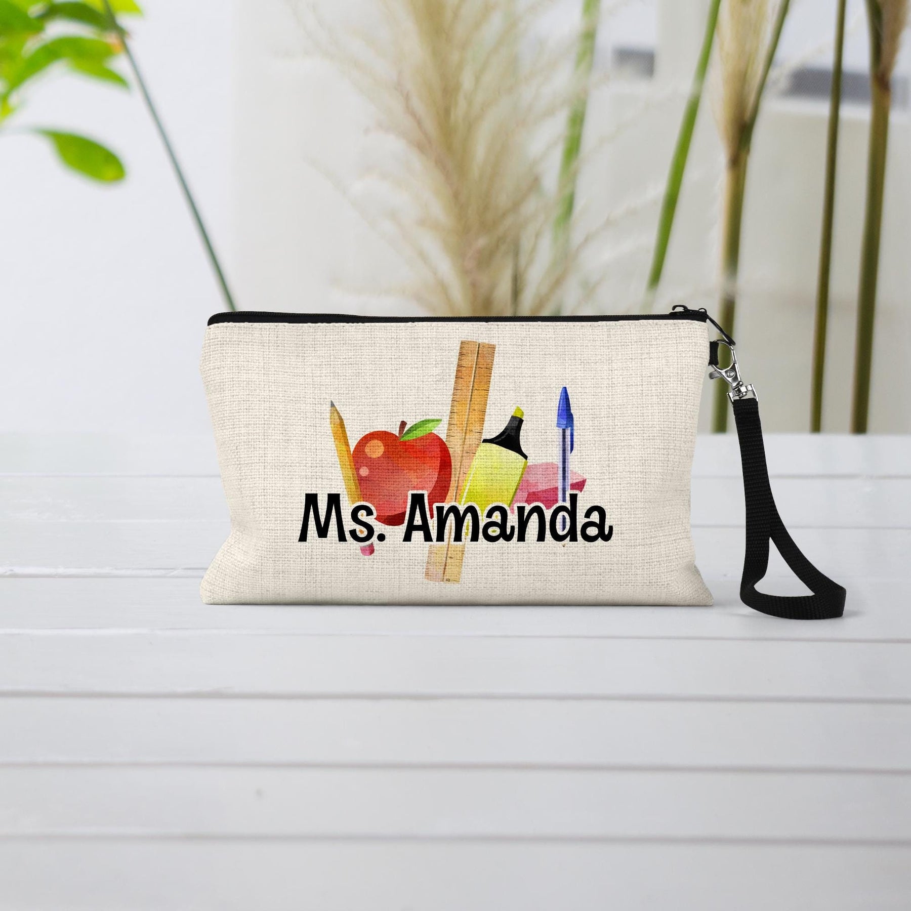 Show your teacher appreciation with this personalized cosmetic bag. Perfect as an end-of-year or teacher appreciation gift, this versatile bag functions as both a pencil pouch and makeup bag. Crafted with durable materials, it's a thoughtful, unique present to honor your favorite teacher's influence. Customizable with their name, this gift encapsulates a memorable school year and highlights the special bond with a treasured educator.