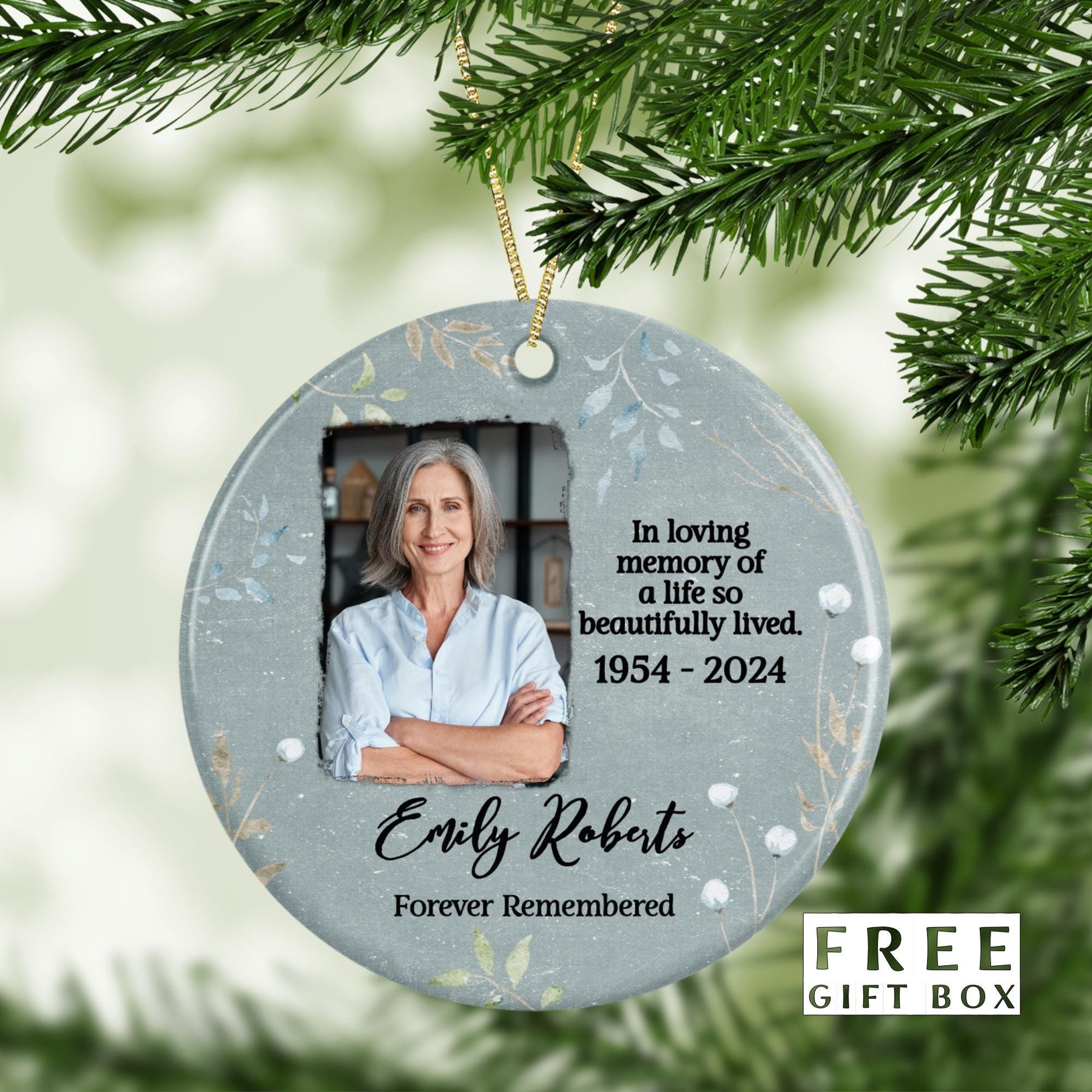 Honor your loved one with this beautiful memorial ornament. Crafted from high-quality ceramic, this photo ornament is a heartfelt sympathy gift for anyone experiencing the loss of dad, loss of mom, or loss of father or mother. Perfect as a family ornament, it serves as a touching keepsake in loving memory. Ideal as a bereavement gift, grief gift, or remembrance in memory of someone special, this ornament provides comfort during the holidays and beyond. A lasting tribute to cherish their memory year after year.