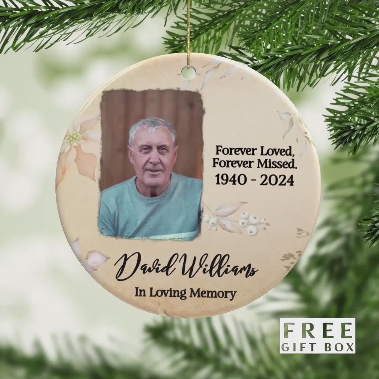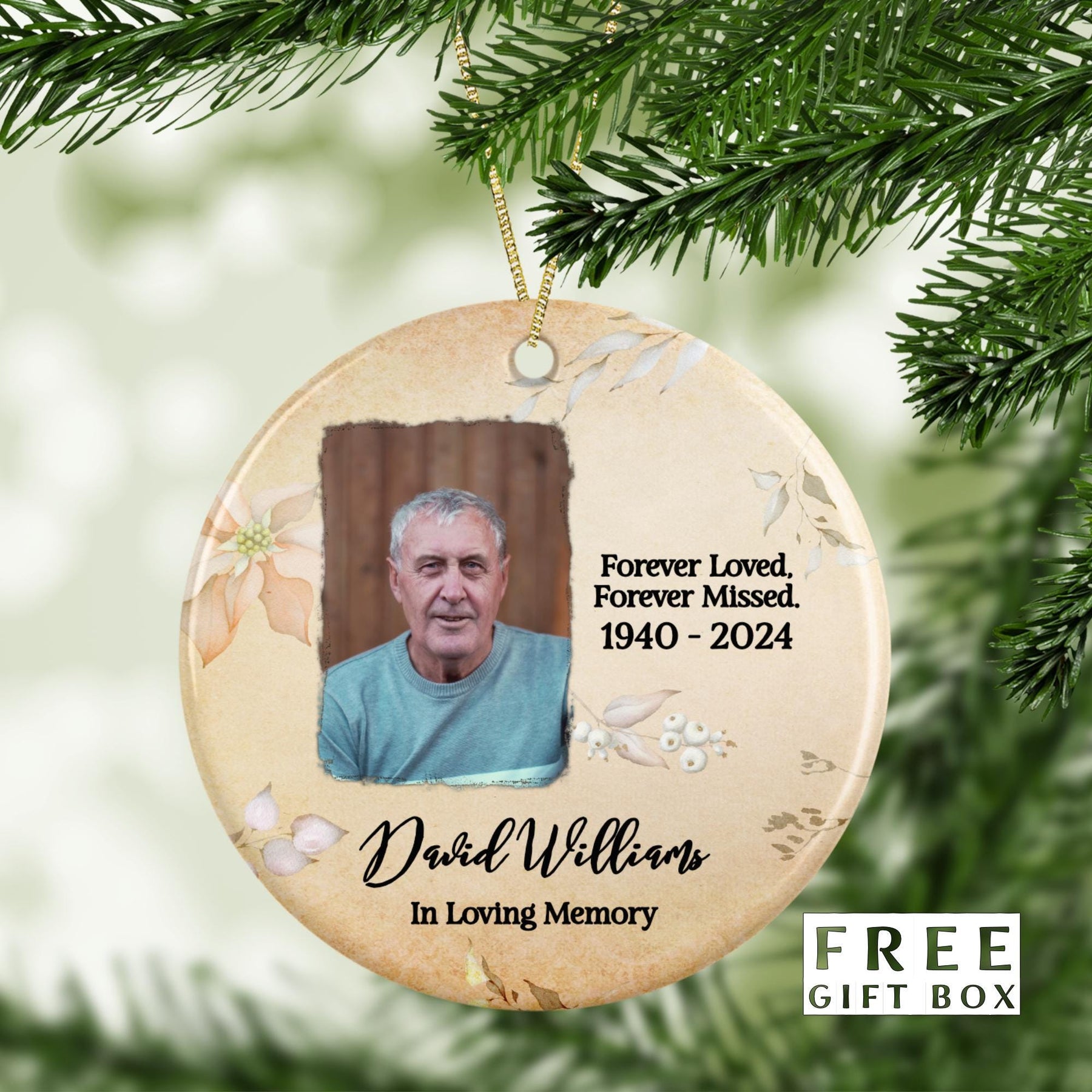 Honor your loved one with this beautiful memorial ornament. Crafted from high-quality ceramic, this photo ornament is a heartfelt sympathy gift for anyone experiencing the loss of dad, loss of mom, or loss of father or mother. Perfect as a family ornament, it serves as a touching keepsake in loving memory. Ideal as a bereavement gift, grief gift, or remembrance in memory of someone special, this ornament provides comfort during the holidays and beyond. A lasting tribute to cherish their memory year after year.