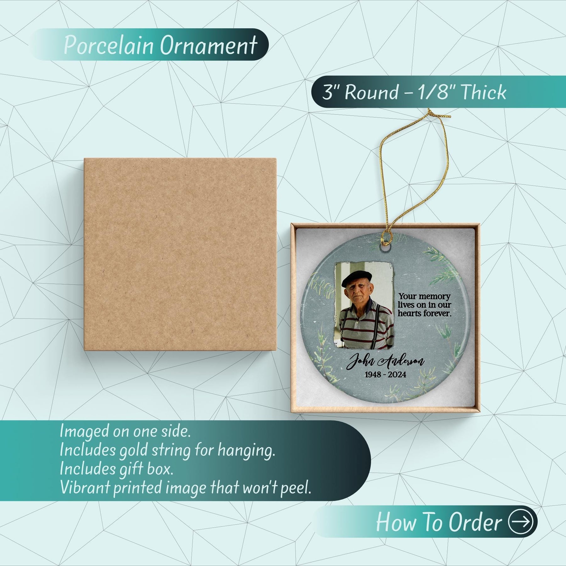 Honor your loved one with this beautiful memorial ornament. Crafted from high-quality ceramic, this photo ornament is a heartfelt sympathy gift for anyone experiencing the loss of dad, loss of mom, or loss of father or mother. Perfect as a family ornament, it serves as a touching keepsake in loving memory. Ideal as a bereavement gift, grief gift, or remembrance in memory of someone special, this ornament provides comfort during the holidays and beyond. A lasting tribute to cherish their memory year after year.