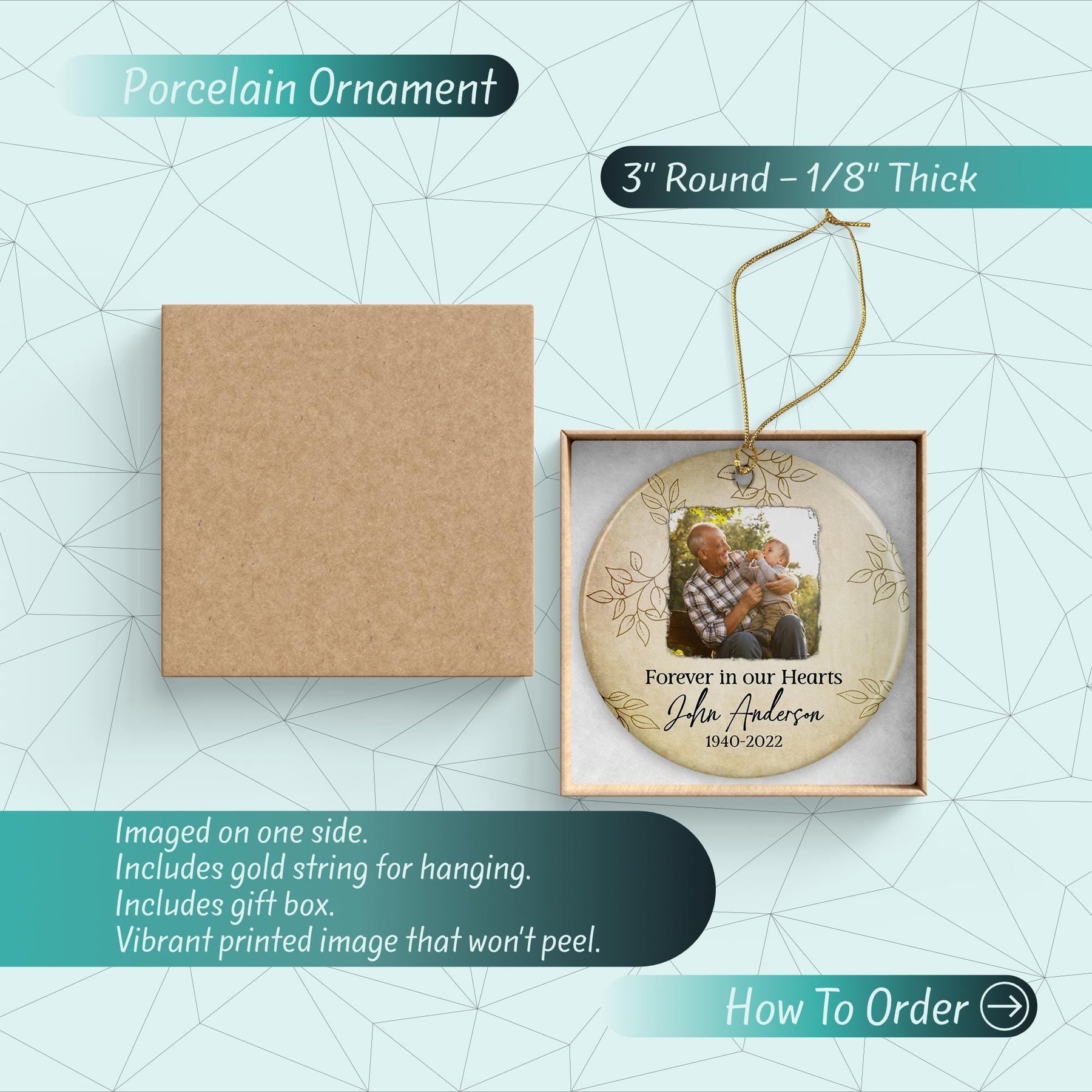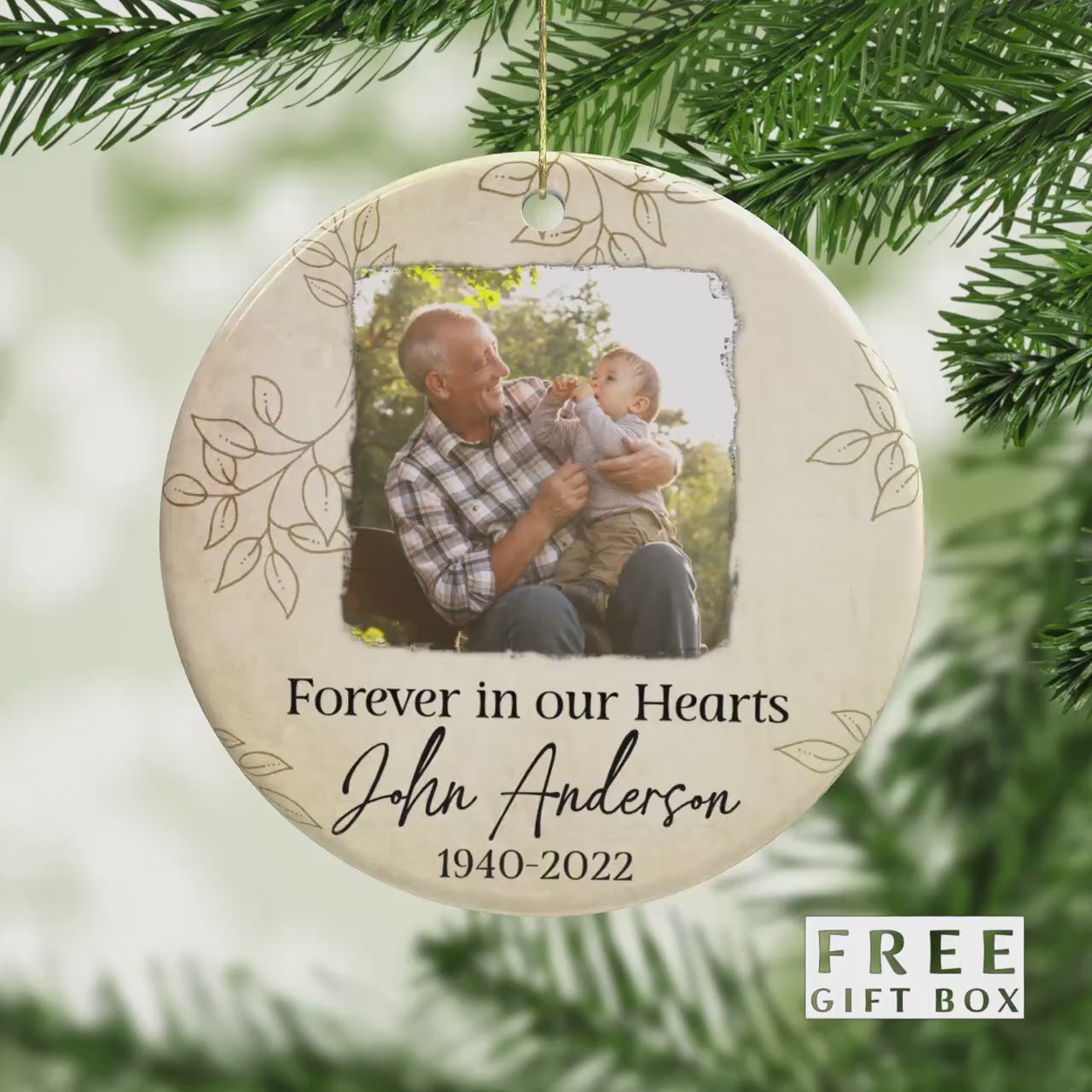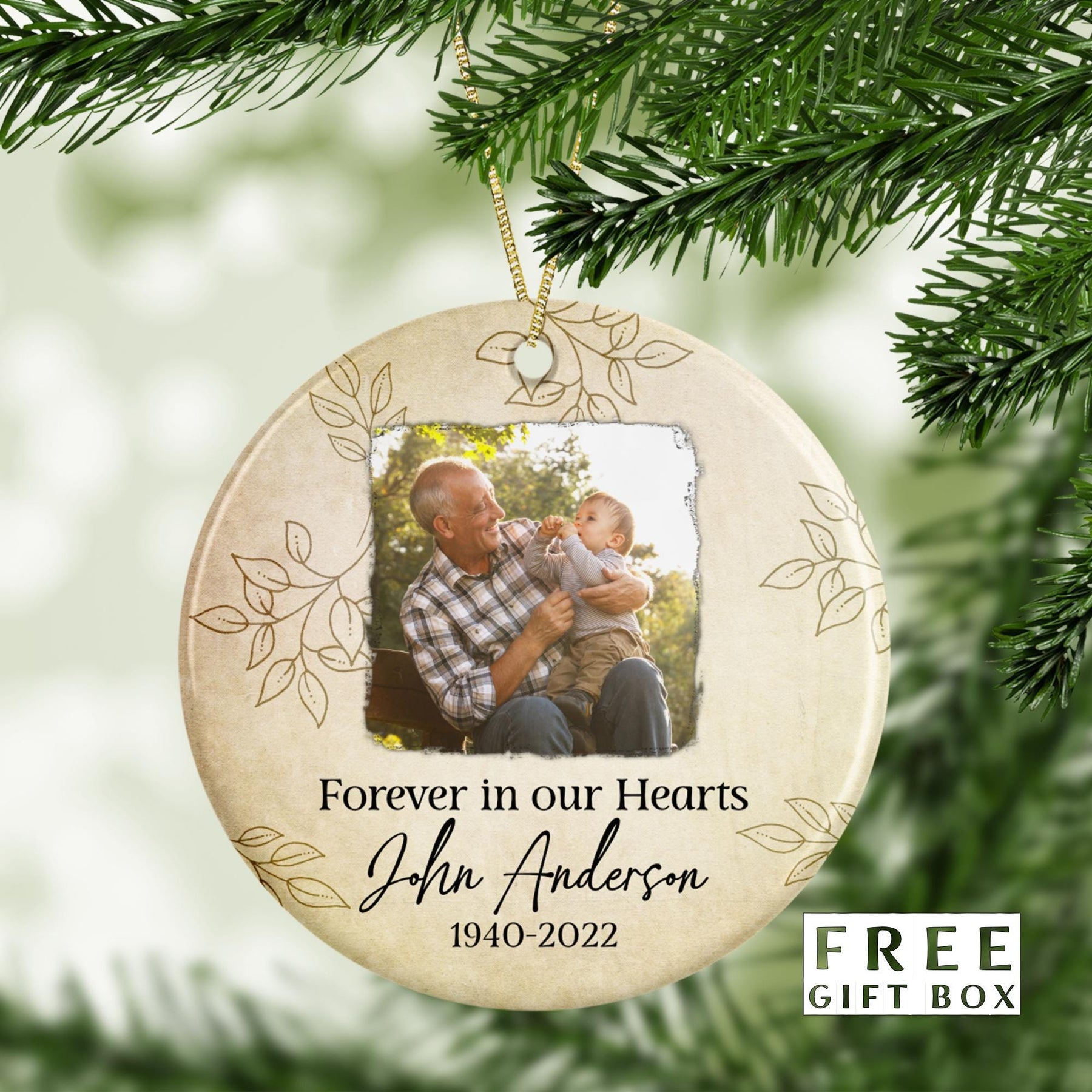 Honor your loved one with this beautiful memorial ornament. Crafted from high-quality ceramic, this photo ornament is a heartfelt sympathy gift for anyone experiencing the loss of dad, loss of mom, or loss of father or mother. Perfect as a family ornament, it serves as a touching keepsake in loving memory. Ideal as a bereavement gift, grief gift, or remembrance in memory of someone special, this ornament provides comfort during the holidays and beyond. A lasting tribute to cherish their memory year after year.