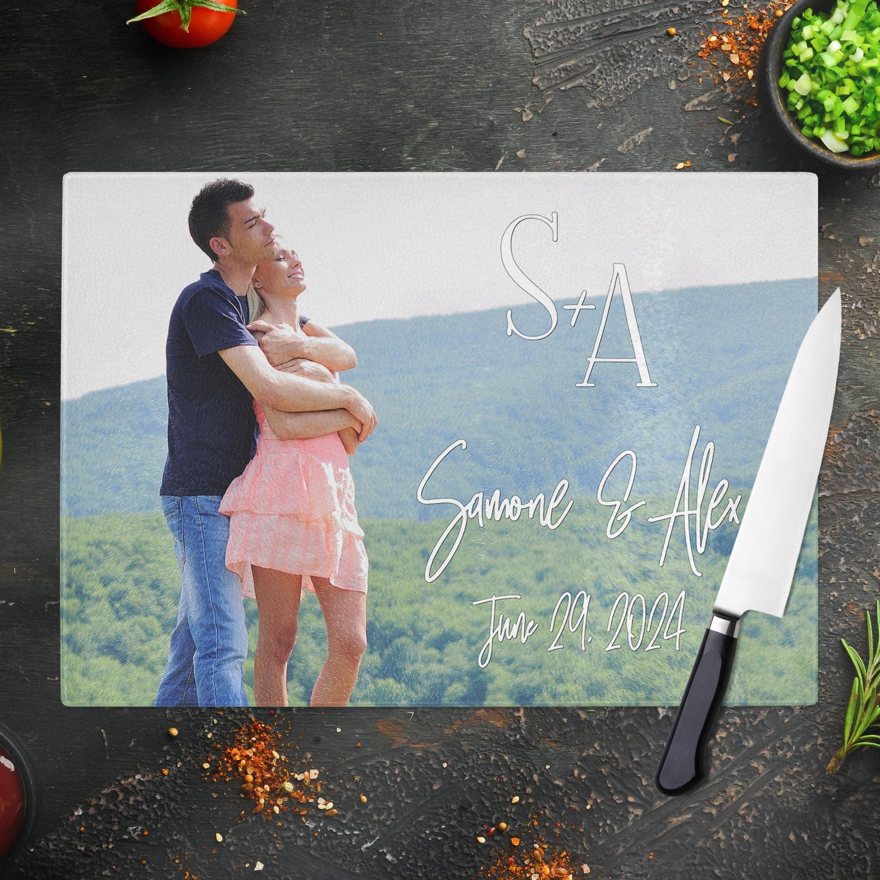 Introducing our Custom Couple Glass Cutting Board, the perfect blend of functionality and sentiment for your kitchen. This large cutting board, expertly crafted from durable glass, is not just a kitchen accessory but a piece of art. Personalize it with your favorite photo or recipe, transforming it into a unique photo gift. Ideal for chopping or as a stylish cheese board, it adds a personal touch to any kitchen decor. A thoughtful wedding shower or closing gift, this custom cutting board is a memorable keepsake for couples to cherish.