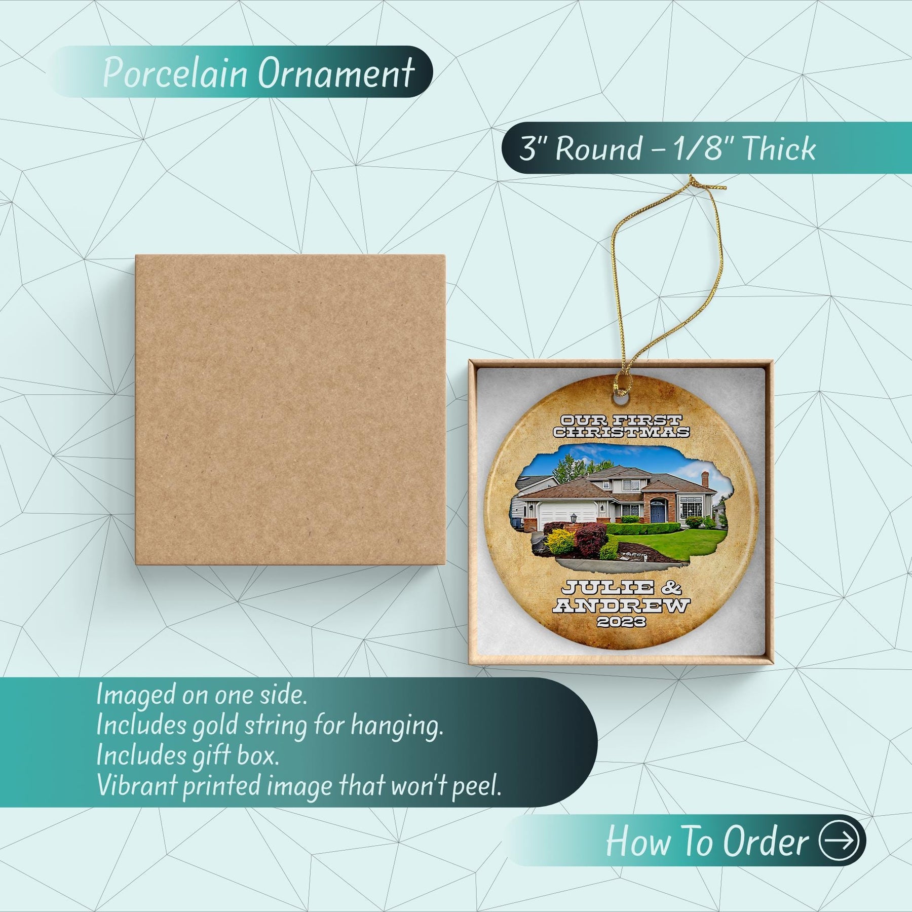 Cherish your special moments with our 3" round porcelain ornament, a perfect keepsake for engagements, weddings, or first Christmas celebrations. The ornament, gloss-finished and imaged on one side, adds a touch of luxury and personal charm to your decor.