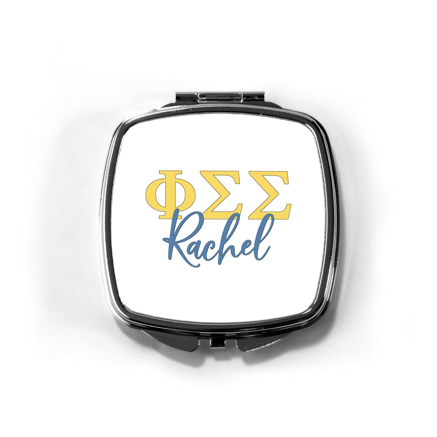 Enhance your sorority style with our Custom Phi Sigma Sigma Pocket Mirror! This beautifully designed compact mirror features the iconic Greek letters of Phi Sigma Sigma, making it the perfect accessory for quick makeup touch-ups or checking your reflection on the go. It's a thoughtful sorority gift for both big and little sisters, and a must-have addition to your sorority merch collection. Embrace Greek life in style with this personalized mirror compact, proudly displaying your sorority letters. Stay picture-perfect with this Phi Sigma Sigma makeup mirror, exclusively crafted for you!