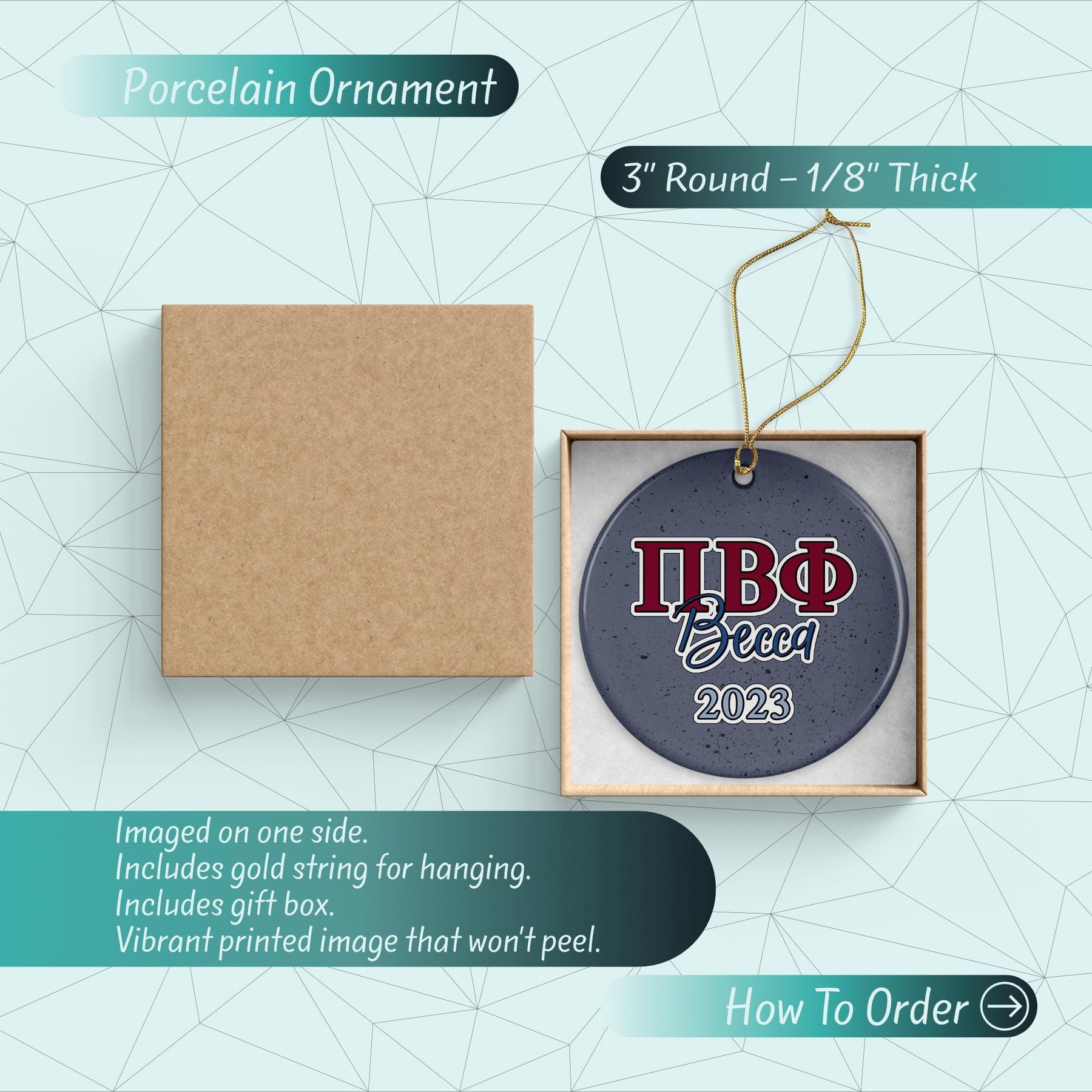 Discover our elegant 3" Round Porcelain Ornament. Crafted with care, it features a unique image on one side with a vibrant gloss finish. This ornament shines beautifully, reflecting light off its surface. It includes a luxurious gold string for easy hanging and a charming gift box, making it a perfect present. This isn't just a decoration, it's a piece of art to elevate your home decor.