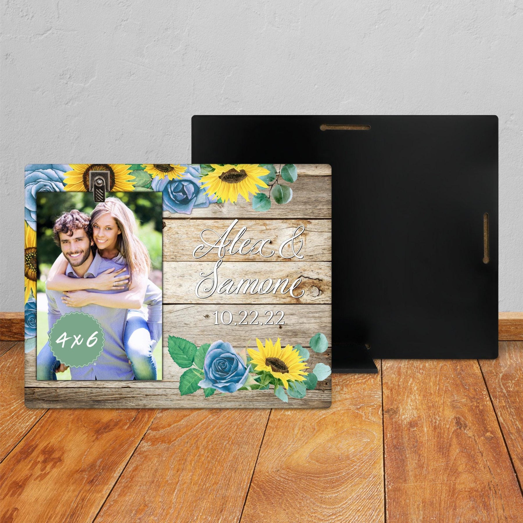 Celebrate love with our unique Personalized Wedding Photo Frame, an ideal gift for the newly engaged or wedding shower. This beautiful Picture Frame, adorned with sunflowers and blue roses, adds an elegant touch to your cherished memories. Make it truly yours with our Custom Frame option - engrave names, dates, or a special message. This Custom Picture Frame is more than just a frame, it's a keepsake that will be treasured for years to come. Your personalized picture deserves a frame that's equally special.