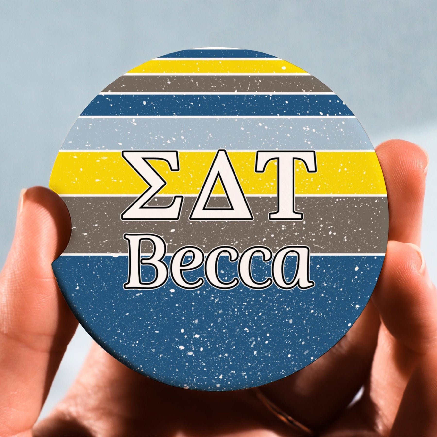 ["Big Little Sorority","Car Coasters","Car Decor","Coasters","Custom Sorority","Cute Car Accessories","Greek Gifts","Sigma Delta Tau","Sorority","Sorority Gift","Sorority Gifts","Sorority Letters","Sorority Merch"]