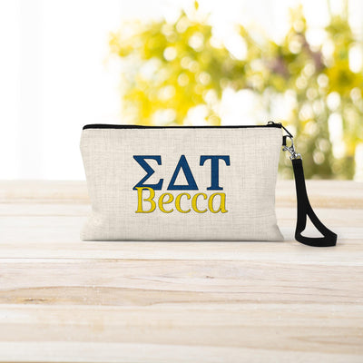 ["Big Little Sorority","Cosmetic Bag","Custom Makeup Bag","Custom Sorority","Greek Gifts","Make Up Bag","Makeup Bag","Sigma Delta Tau","Sorority","Sorority Gift","Sorority Gifts","Sorority Letters","Sorority Merch"]
