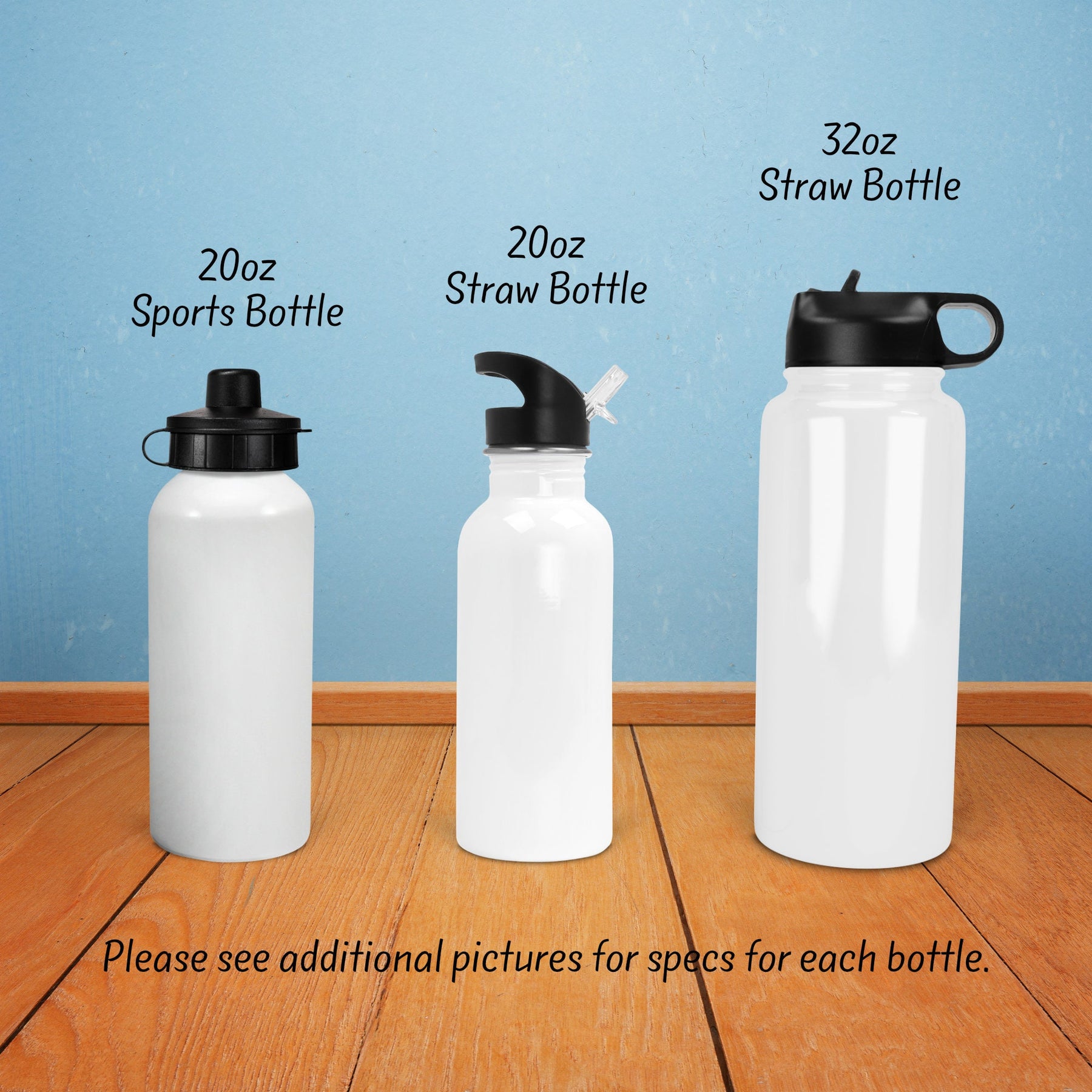 Enjoy optimal hydration with our 20oz Sport Bottle. Made from durable, FDA-approved aluminum, this white bottle comes with two interchangeable tops. The unique image printed directly on it adds a personalized touch.
