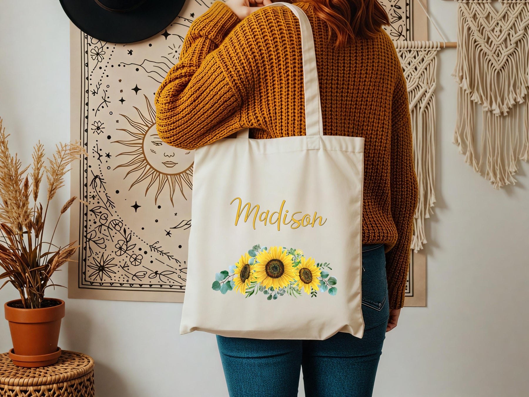 Brighten someone's day with our personalized sunflower tote bag. This cute tote bag is ideal for bridesmaid proposals, making it a charming bridesmaid tote bag. Also perfect as a teacher appreciation gift, this versatile travel bag is both functional and stylish. Made from durable canvas, it serves as a beach tote, teacher tote, or everyday tote bag canvas. Embrace the tote bag aesthetic with this custom tote bag, designed to be both practical and beautiful. Show your love with this unique, personalized tote.
