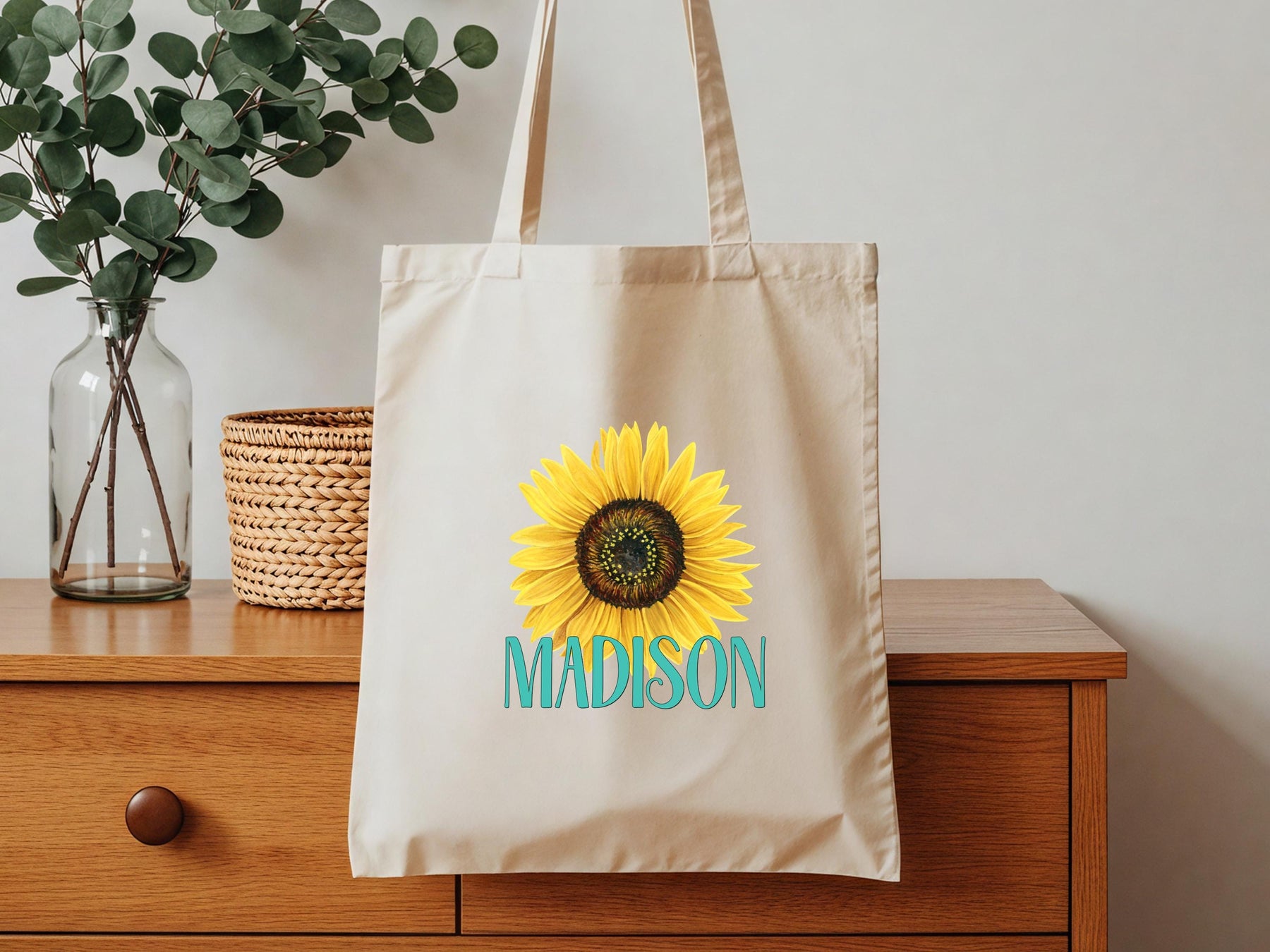 Brighten someone's day with our personalized sunflower tote bag. This cute tote bag is ideal for bridesmaid proposals, making it a charming bridesmaid tote bag. Also perfect as a teacher appreciation gift, this versatile travel bag is both functional and stylish. Made from durable canvas, it serves as a beach tote, teacher tote, or everyday tote bag canvas. Embrace the tote bag aesthetic with this custom tote bag, designed to be both practical and beautiful. Show your love with this unique, personalized tote.