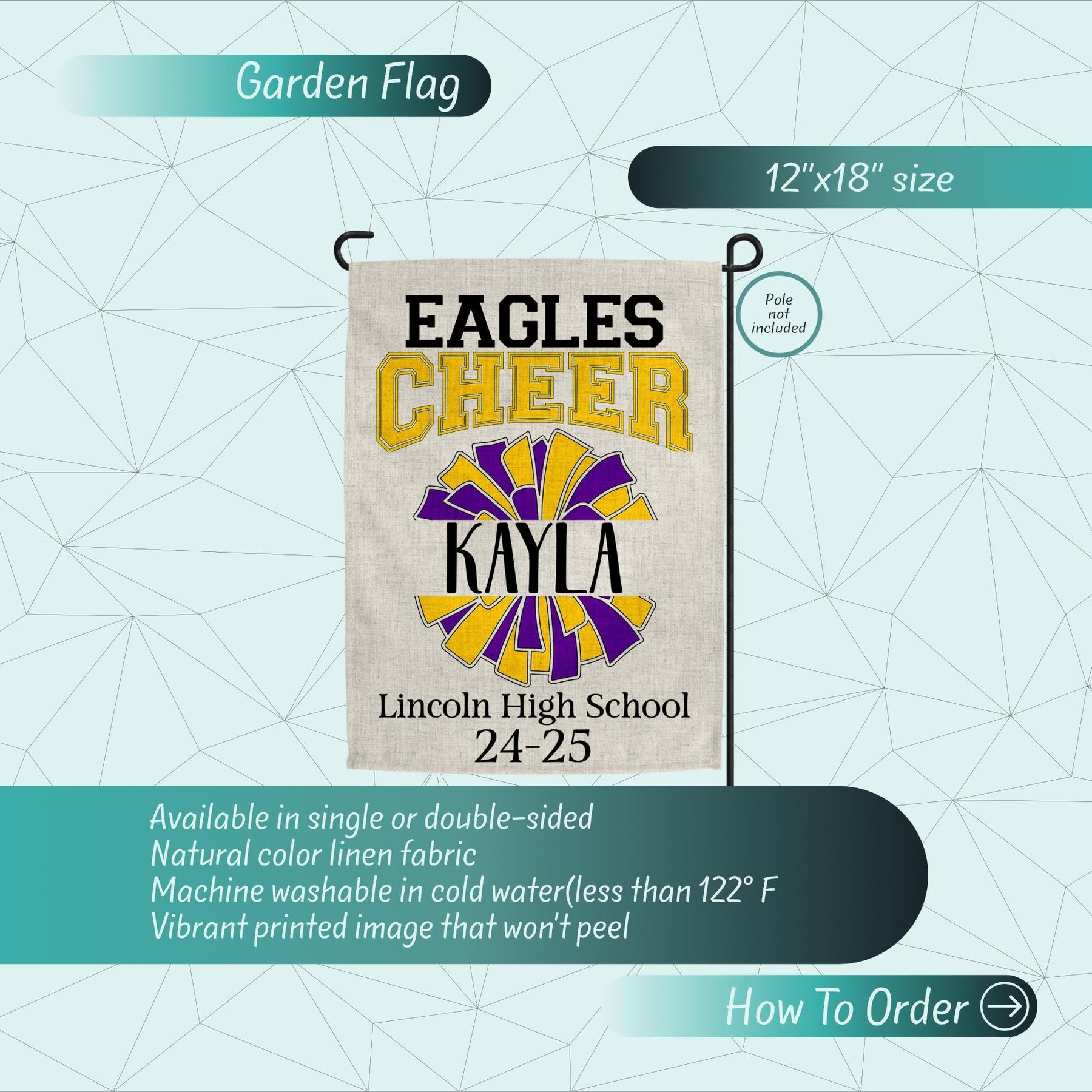 Celebrate your cheer star's achievement with our Class of 2025 Graduation cheer Garden Flag! Whether you're a proud Cheer Mom, Dad, or Coach, this flag proudly displays your support. Made with durable materials, this senior garden flag features vibrant colors and bold graphics, perfect for showcasing your graduate's accomplishment. It's an ideal addition to your yard or garden, making a statement for the whole neighborhood to see. Show your team spirit and honor your senior with this personalized yard flag, a memorable keepsake for years to come.