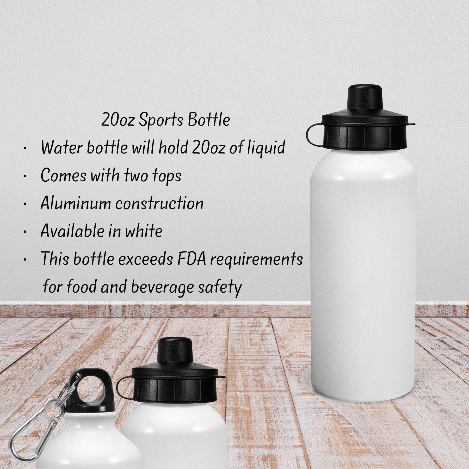 Enjoy optimal hydration with our 20oz Sport Bottle. Made from durable aluminum, this white bottle comes with two interchangeable tops. The unique image printed directly on it adds a personalized touch.