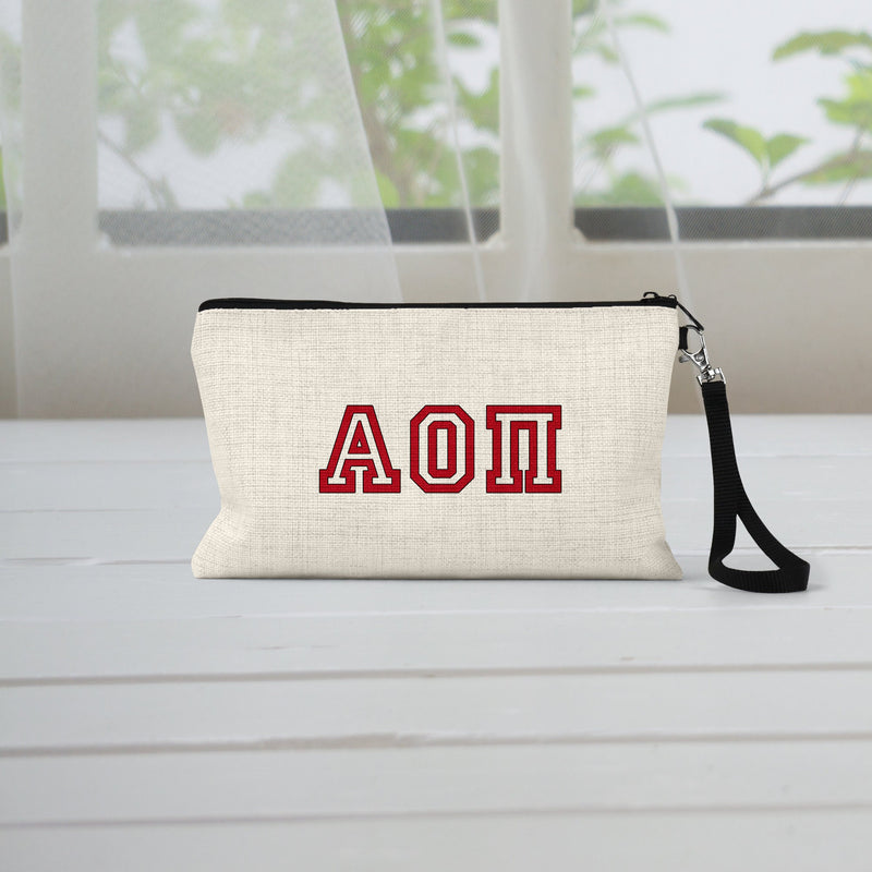 ["Alpha Omicron Pi","Big Little Sorority","Cosmetic Bag","Custom Makeup Bag","Custom Sorority","Greek Gifts","Make Up Bag","Makeup Bag","Sorority","Sorority Gift","Sorority Gifts","Sorority Letters","Sorority Merch"]