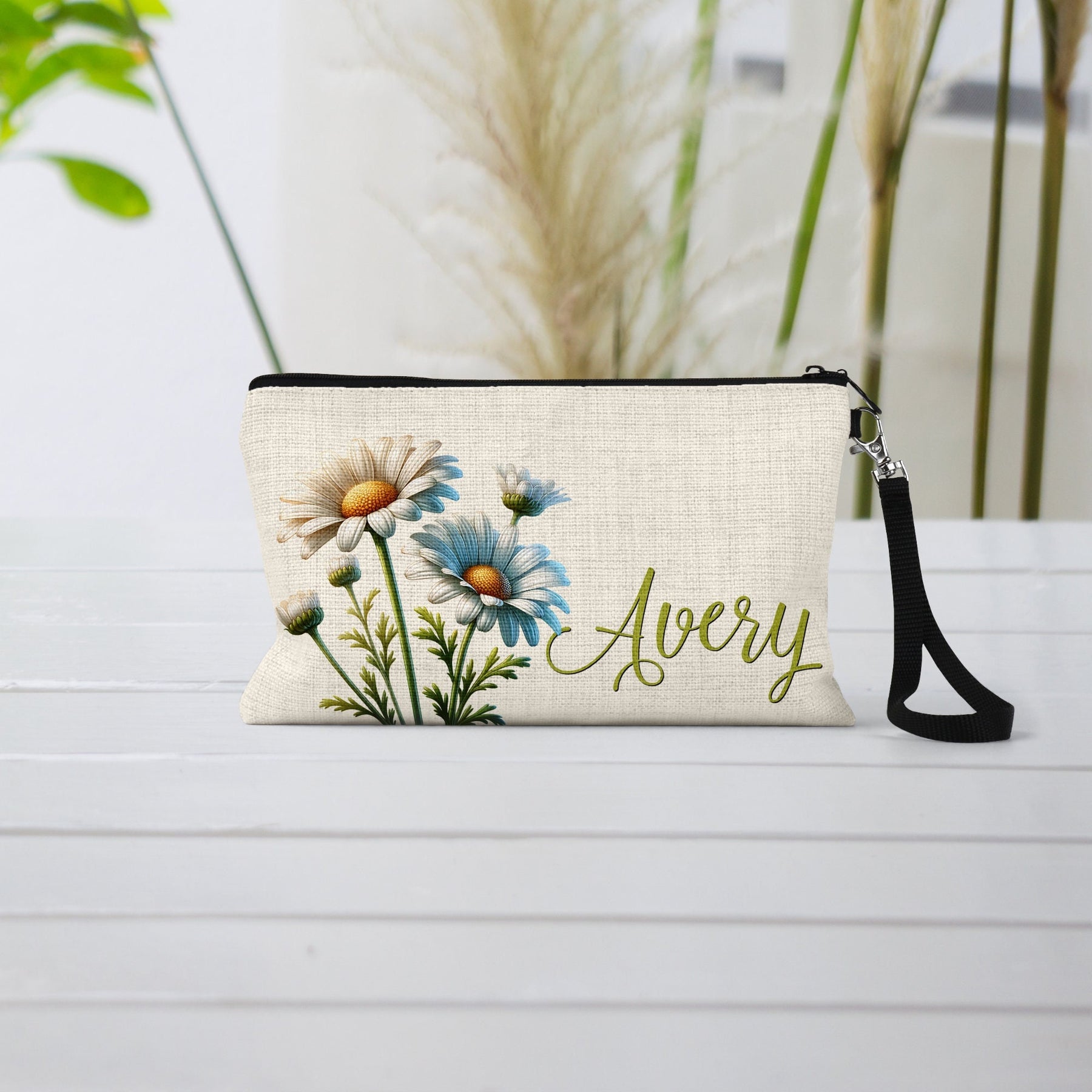 Daisy Linen Zipper Pouch: April Birth Flower Cosmetic Bag
