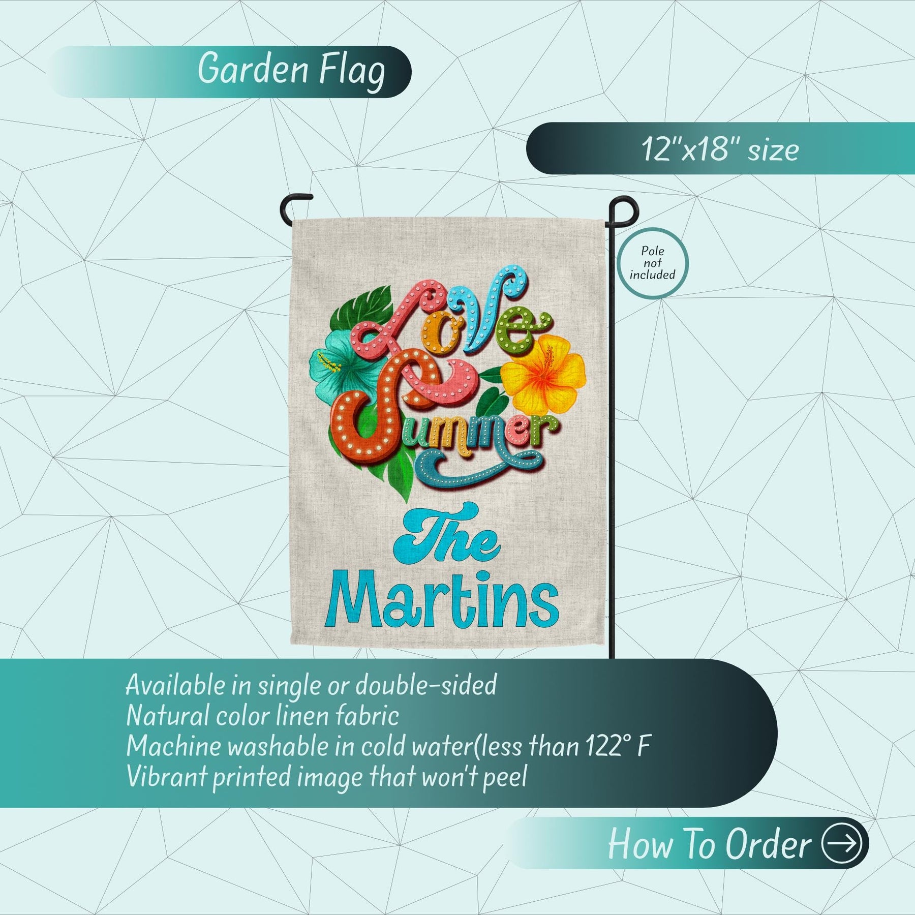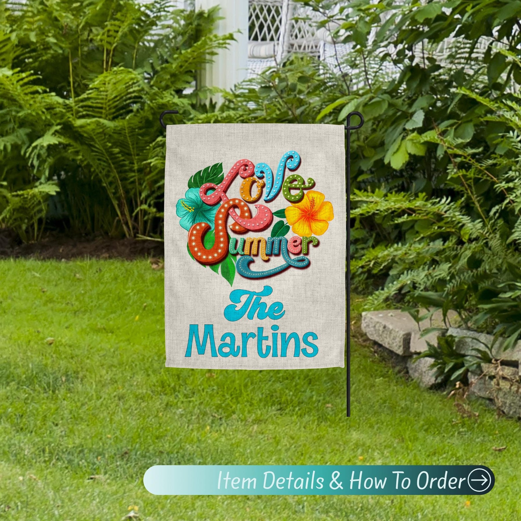 Celebrate summer with our Hello Summer garden flag, perfect for beach decor enthusiasts! This custom flag adds a splash of color to your garden decoration and makes a charming welcome sign. Personalize your garden decor with this summer flag, ideal for enhancing your patio decor and yard art. Whether as a new home gift or a seasonal touch, this versatile flag complements any summer decor theme. Make your personalized garden pop with this stylish addition!