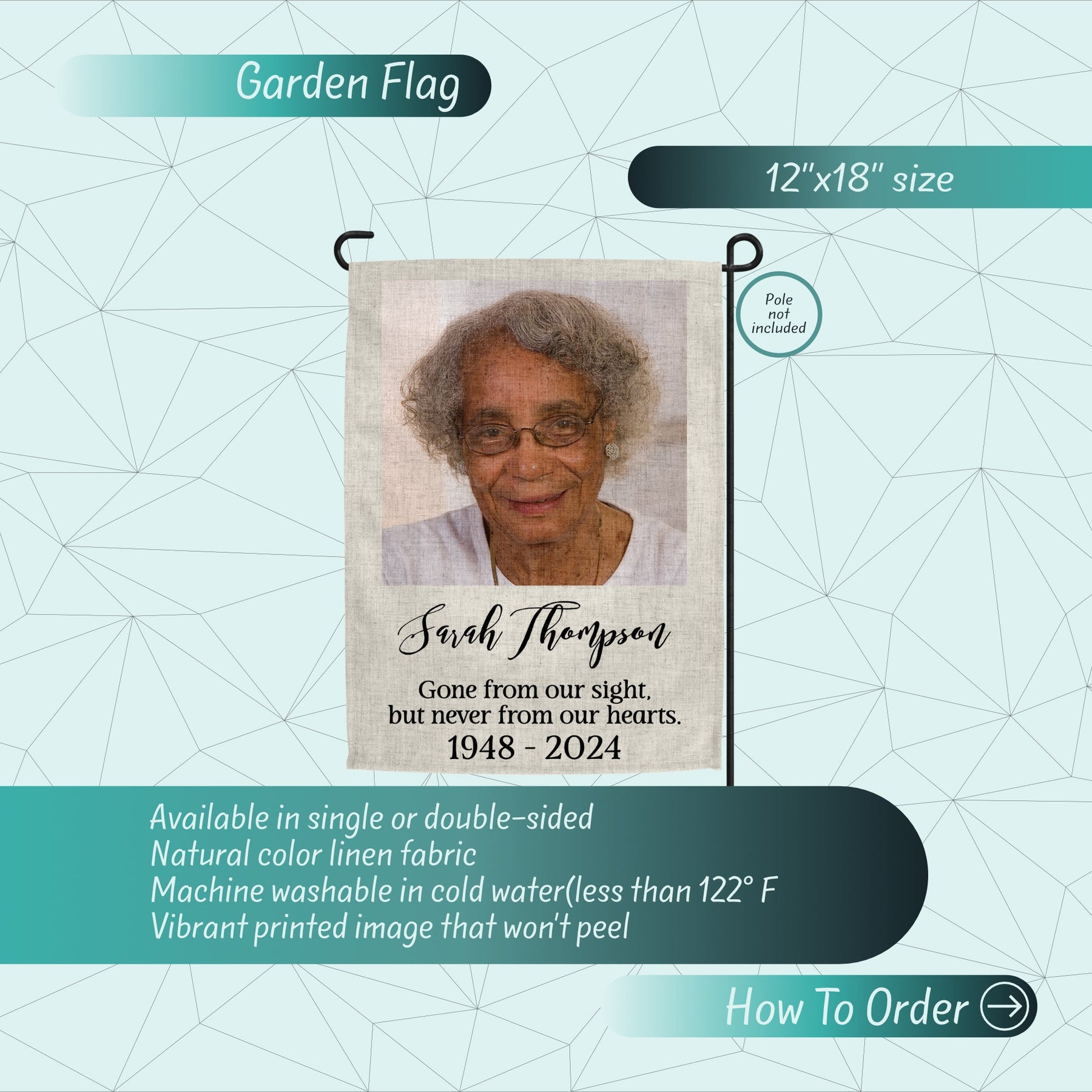 Honor the loss of a loved one with this exquisite Garden Memorial Flag. Perfect for cemetery decorations or as a sympathy gift, this memorial flag can be fully customized. Ideal as yard art or garden decoration, it serves as a touching reminder in loving memory of those who have passed. Display this elegant garden flag in your yard to keep their memory alive.