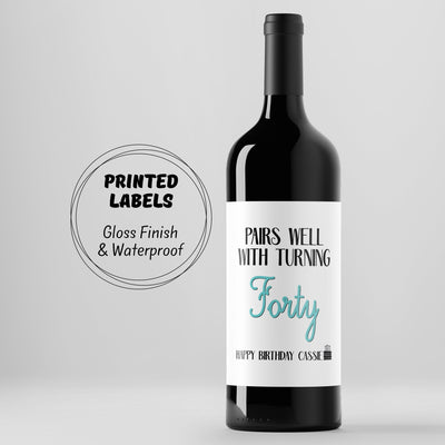 Pairs Well with Turning 40, 40th Birthday Wine Label, Custom Birthday Wine Label, Birthday Gift for Women, Gift for Her, Birthday Champagne