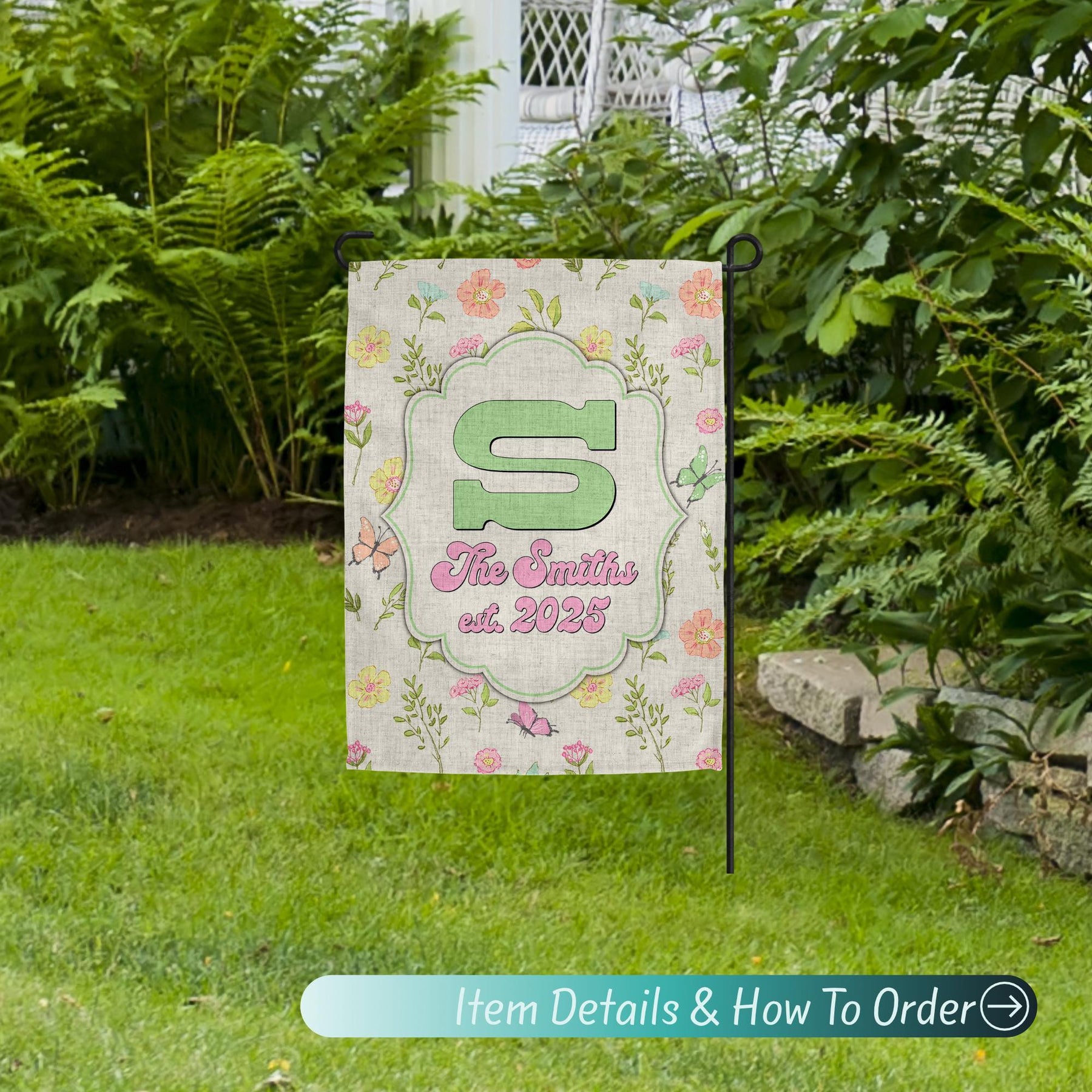 Welcome guests in style with this Custom Garden Flag featuring your Family Name Sign! Perfect for Easter Decor, Summer Style, or everyday Porch Decor, this Last Name Sign adds charm to your Yard Art and Garden Decoration. A lovely Gardening Gift or thoughtful housewarming idea, this Welcome Sign pairs beautifully with a Door Wreath for a complete look. Whether you're updating your Yard Decor or gifting a Custom Flag to someone special, this personalized flag brings warmth and personality to any outdoor space.