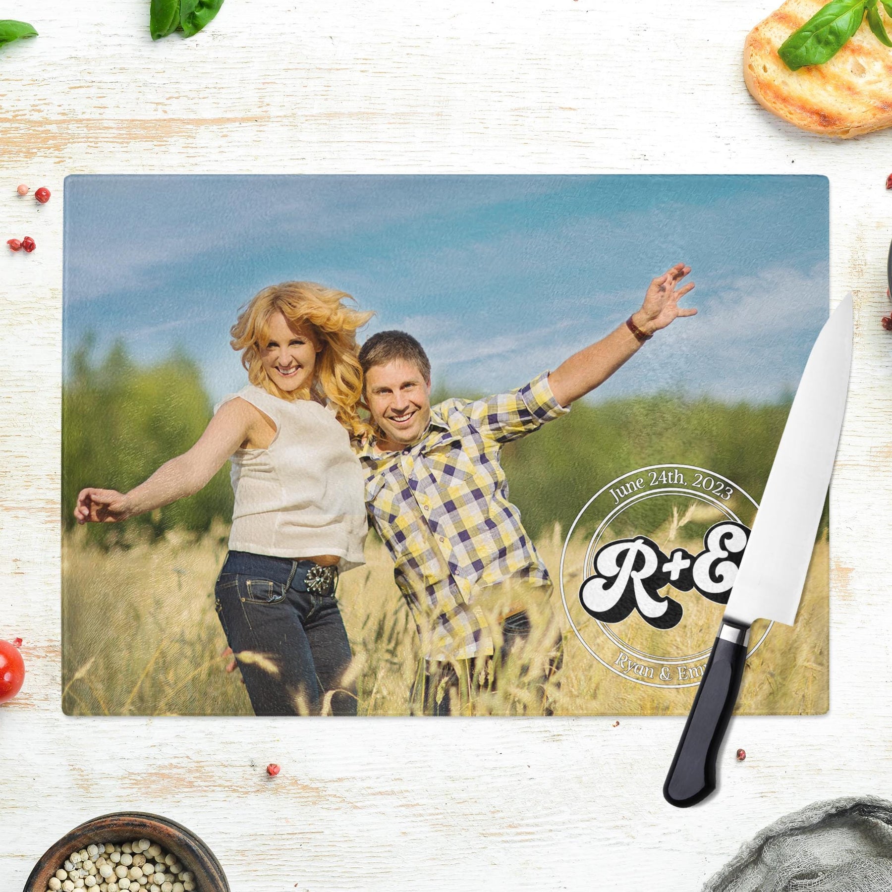 Introducing our Custom Couple Glass Cutting Board, the perfect blend of functionality and sentiment for your kitchen. This large cutting board, expertly crafted from durable glass, is not just a kitchen accessory but a piece of art. Personalize it with your favorite photo or recipe, transforming it into a unique photo gift. Ideal for chopping or as a stylish cheese board, it adds a personal touch to any kitchen decor. A thoughtful wedding shower or closing gift, this custom cutting board is a memorable keepsake for couples to cherish.