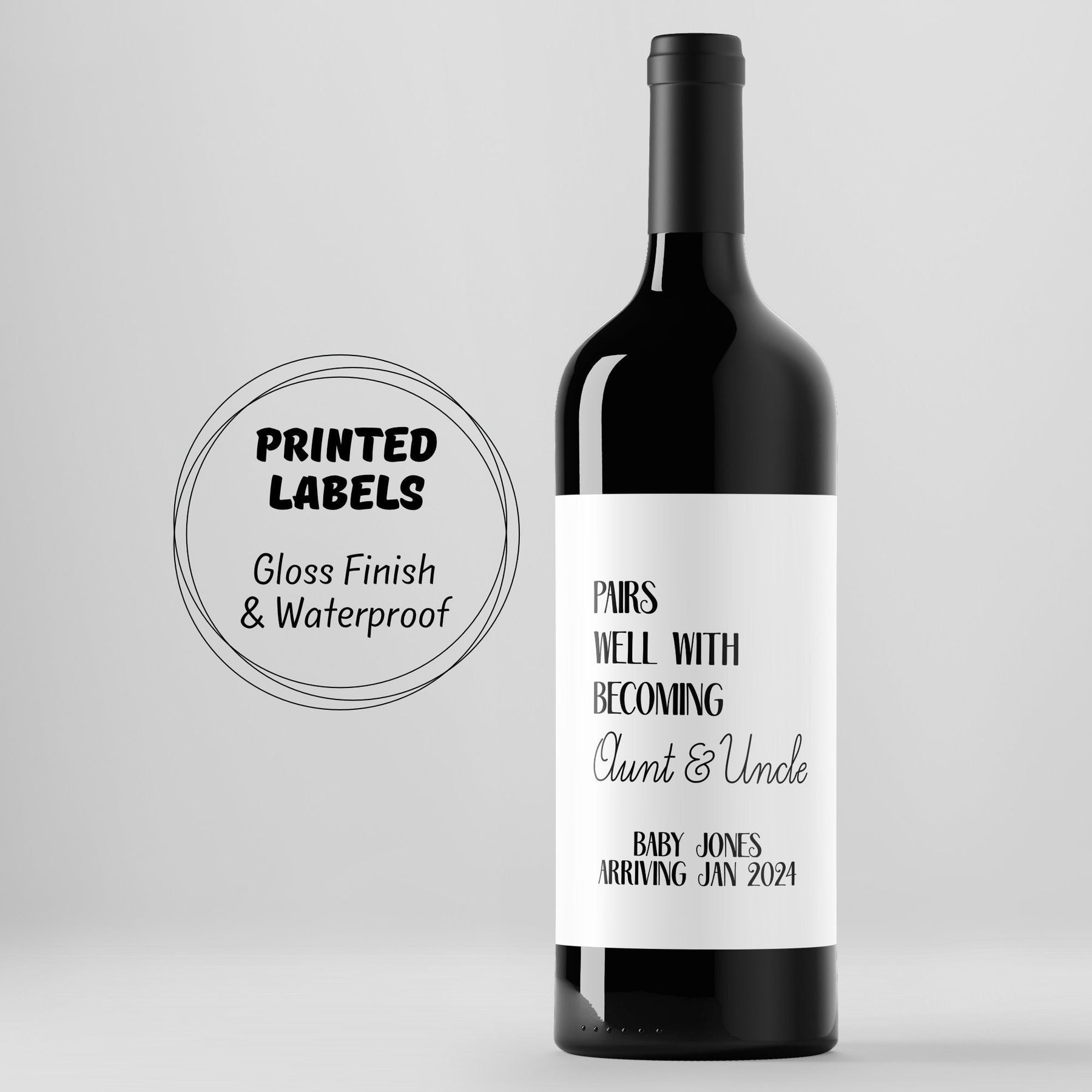 Elevate your wine gift to the next level with our custom wine label, a touch that pairs well with any wine or champagne. Ideal as an uncle gift or aunt gift, these wine bottle labels can be personalized to share special messages, making them perfect for birth announcements. Express your love and celebration with this unique, versatile gift that your aunt and uncle will treasure. A toast to special occasions with our bespoke champagne label!